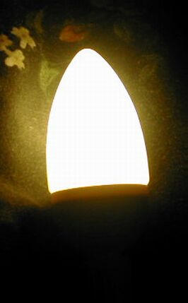 I bought this nightlight from Golden Gadgets for about $4. It is a compact fluorescent nightlight, which plugs into any standard US 110-120VAC wall receptacle. It is rated to consume just 3 watts. A rocker type on/off switch is present on the front of the lamp body, so it can be turned on and off at will. There are no markings anywhere on the lamp body, so I'll have to take the printed ratings on the packaging as gospel. This package claims that the nightlight is as bright as a 25W incandescent light bulb, and lasts 8 times longer than one.