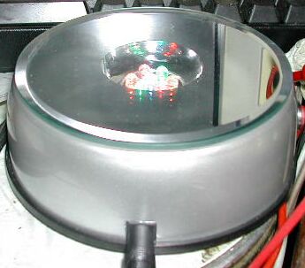 What it's *supposed* to do though, is give you a mirrored surface to put clear glass or crystal articles on, and have them slowly rotate while 7 colored LEDs shine up through the lamp's center and shine into the object you place on it. The LEDs can be run through 7 different patterns, selectable through a red pushbutton on the side of the lamp. You can also turn the motor on or off if you wish with a black pushbutton switch on the side of the lamp, located 90 degrees away from the red button.