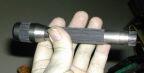 To change the batteries, unscrew the tailpiece and throw it out - OH WAIT, YOU'LL NEED THAT!!! So just set it aside instead. ;-) Tip the two dead AA cells out of the barrel, and dispose of or recycle them as you see fit. Insert two new AA cells into the barrel, button (+) end first, then screw the tailpiece back on.