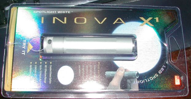 To use the new Inova X1, first you'll need to get it out of its packaging. Slitting the package open with a sharp knife or razor blade along one side of the flashlight or the other ought to do the trick here. The X1 comes ready to use right away, because the battery is already installed.