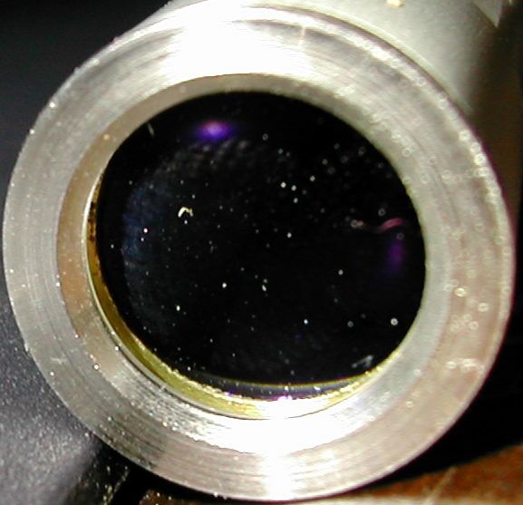 The lens appears to be made of glass, is convex (magnifying) and is antireflective (AR) coated on at least one side. The lens is recessed for protection, so the usual "drag and wipe" technique for cleaning lenses won't work here. I'm not certain how you should clean this lens to keep it pristine and keep the AR coating intact...guess I'll cross that bridge when I get to it.