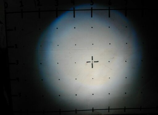 The light from the white LEDs is focused by lenses moulded into the protective plastic window; this allows them to "throw" farther than white LEDs with no lenses in front of them. The light is focused into a circle-shaped beam with sharp edges, not too unlike that produced by a Brinkmann Long Life LED flashlight.