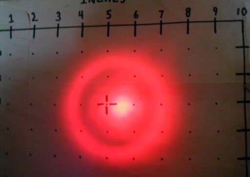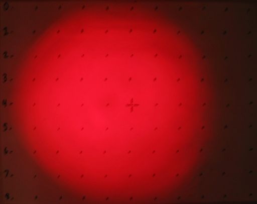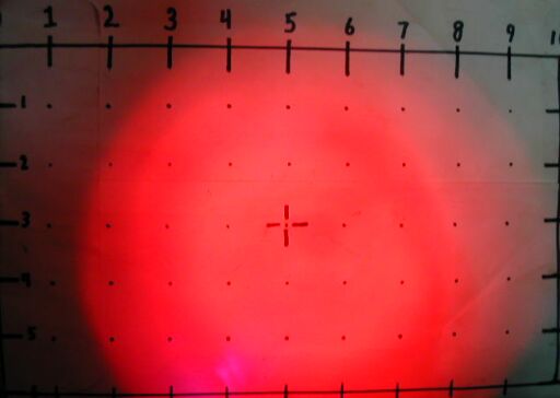a white test surface very brightly. When shone at a more distant target, a distinct central beam is evident, surrounded by a dimmer corona. An LED like this