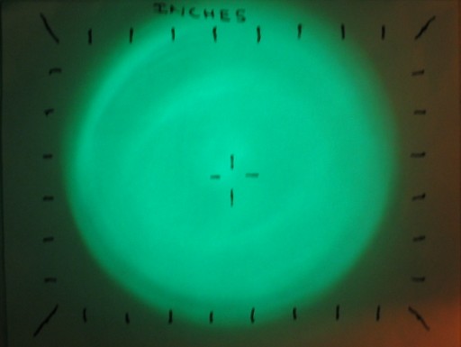 Beam photograph on the test target at ~12" (green die).