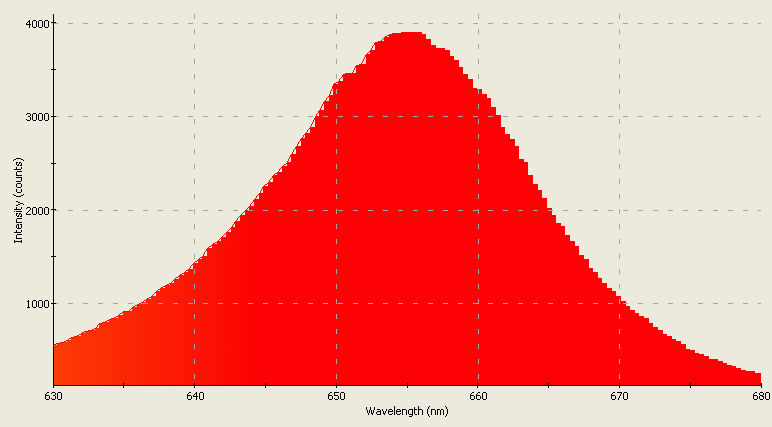 Spectrographic analysis of this LED (red die); spectrometer's response narrowed to 630nm to 680nm.