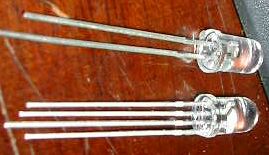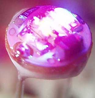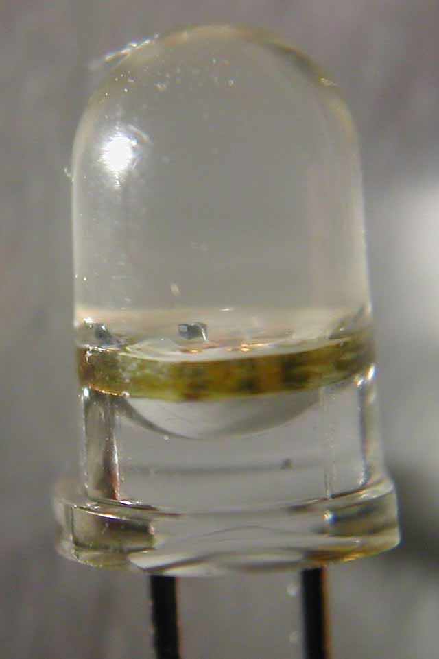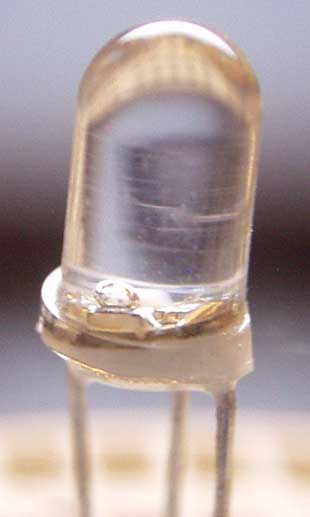 This is a 5mm water-clear epoxy bodied LED that was sent to me by a fan of this website. It is an RGB LED that flashes all by itself using a circuit that's built into the LED itself.