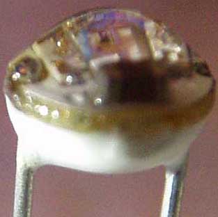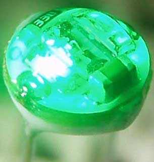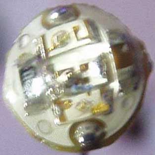 Although it is labelled as a "flashing LED" and it's the same diameter as an ordinary LED, if you look closely you can see some SMD parts and some other structures inside the epoxy dome. I don't see an exposed IC; it actually appears the flasher circuit is three seperate ICs, each one mounted inside a tiny ceramic block, and each with an LED die mounted to its top. It is also possible that the IC is a larger device and is mounted underneath the visible components. In any case, this very interesting component is actually a complete, microminiature PCB with flasher circuit and three LED chips, all encased in a discrete, LED-like ceramic & epoxy package.