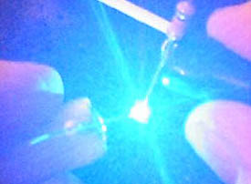 Left: ISP's blue LED compared with an ordinary 5mm LED and some 1/4 watt resistors.
