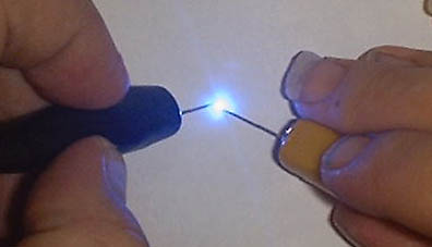 The right-hand picture shows one on paper with thin wire leads soldered to it.