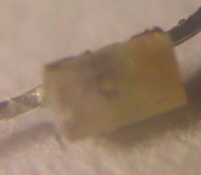 Close-up of one. You can see the actual die and the two bond wires inside the clear encapsulant.