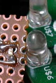 A fan of the website send me this LED in early-2003, already affixed to a piece of breadboard and outfitted with a resistor, reverse-polarity protection diode, and a 9V battery connector. I somehow managed to lose or misplace it, but it turned up on 11-18-04 while I was looking through boxes following a move I made on 10-11-04.