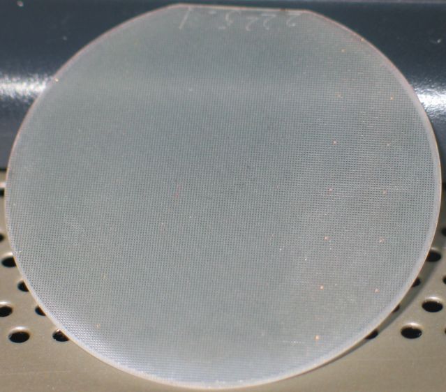The wafer shown in these photographs was developed using a Hydride Vapour Phase Epitaxy process (HVPE) as opposed to MOCVD (Metal Oxide Chemical Vapour Deposition) or MBE (Molecular Beam Epitaxy). The following site contains a brief synopsis of the HVPE process and the difference between it and MOCVD: