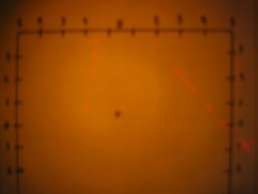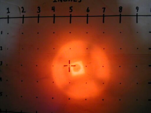 When shone at a more distant target, the square central beam becomes slightly diffuse, and a very narrow pinpoint of brighter light appears at the center.