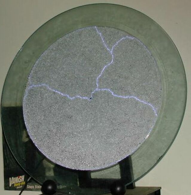 From the Luminglas website: Lightning mysteriously dances inside a disk of fine quality glass less than a 1/2" thick. Luminglas transforms electric current into a spectacular array that is very unique. Adjust the size and shape of the light with easy to use controls. Includes a sound response control which creates a pulsating rhythm of light that will respond to music or voice with no wires.