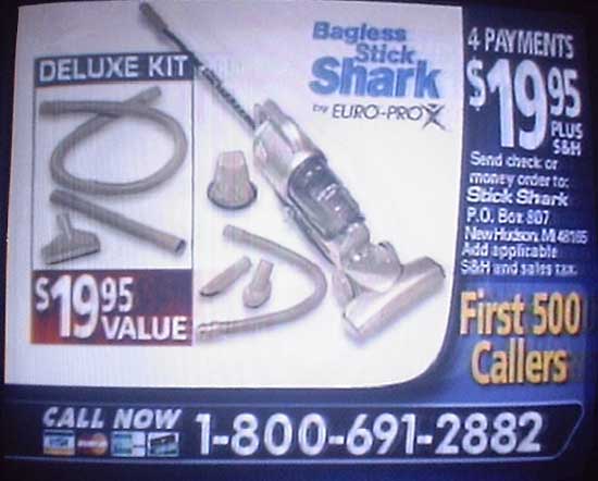 In another "test", the Stick Shark is pitted against an electric broom, an ordinary upright vacume, and a handheld dust devil type cleaner.