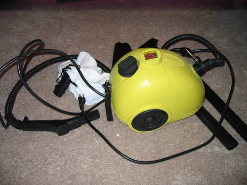 Now we can get right down to business: The Steam Buggy is a large, portable steam generating device that looks a lot like a big canister vacuum cleaner, piss yellow in color, and