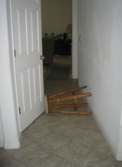 This stool is on the floor in the hallway between my sister's and my rooms and the rest of the house. It is there to keep the dog out of our rooms; he is elderly and in rather poor health, and would not make it outside in time when he needs to go tee tee (piss) - since this is a rental property, keeping the carpeting in our rooms "pee free" is a rather high priority.