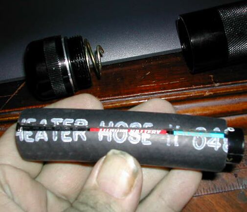 The Space Needle II uses three CR-123A batteries enclosed in a length of rubber hose or tubing, rather than two C cells like the Mag Lite body was made for, so the battery change procedure is a bit different.