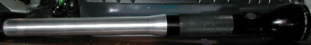 Inside, was an "Assault and Batteries" (or "Photon Baton") battery extension barrel for all Space Needles in the 2-C Mag Lite body. The A&B tube lets you use 6 AA cells in your Space Needle or Space Needle II flashlight, instead of 3 CR123A cells. Not only are AA cells a lot less expensive than CR123 cells in most areas, you can use the flashlight as a defensive weapon if need be. (Note: Not recommended!)
