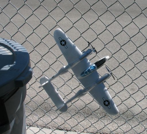 Here's where my poor, defenseless little P-38 R/C "Park Flyer" Airplane landed on the flight I made on 07-15-09 (this is inside the dugout - it actually flew through the open doorway of the fenced-in dugout to end up here!!!)...note the garbage can nearby - as you can see, it was very easy to retrieve the airplane from this fence.