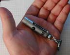 This small keychain type micro-torch features a red LED and uses two LR-44 type button cells for power.