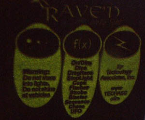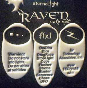 The Rave'n is a pager-sized, microprocessor controlled, 4-LED party light. It features four colored LEDs, a glow-in-the-dark control panel, and a whole laundry list of fun & playful special effects.