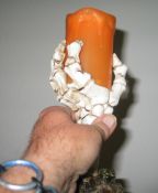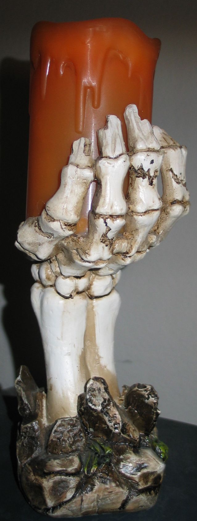 The orange "candle" portion is held aloft by a skeletonised "hand" that appears to be rising from the dirt of a graveyard, so it fits the Halloween season quite nicely. The dirt and bones are made of a handpainted polyresin, so it does look quite realistic.