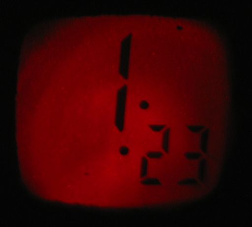 There is no traditional clock face on this product; instead, you simply aim it at a wall, press a button, and see the time projected on the wall in black characters on a red background!