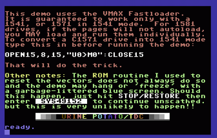 Linked demos are downloadable, and can be run on WinVice v1.19; set the video mode to "NTSC", set disk drive (#8) to "true drive emulation" and set drive type to "1541 II" to allow the FLI graphics to display properly and allow the VMax fastload routine I used in my megademos to function properly.
