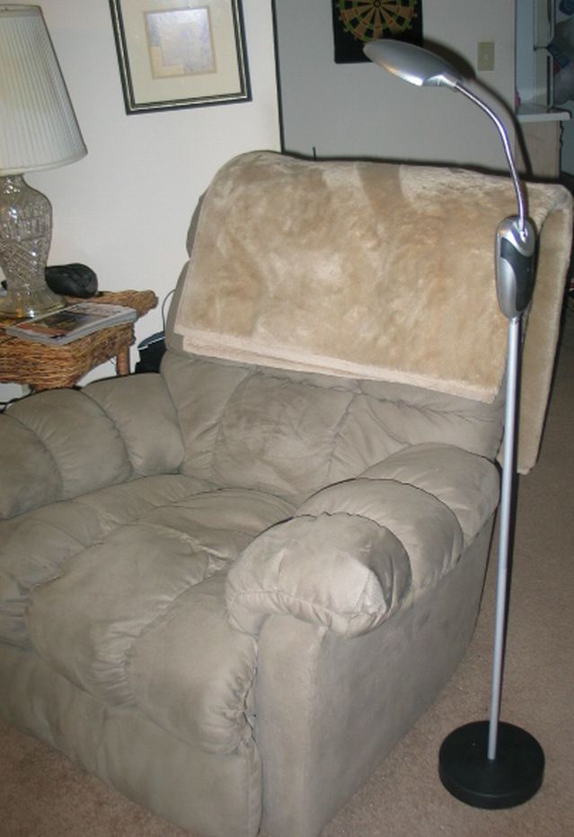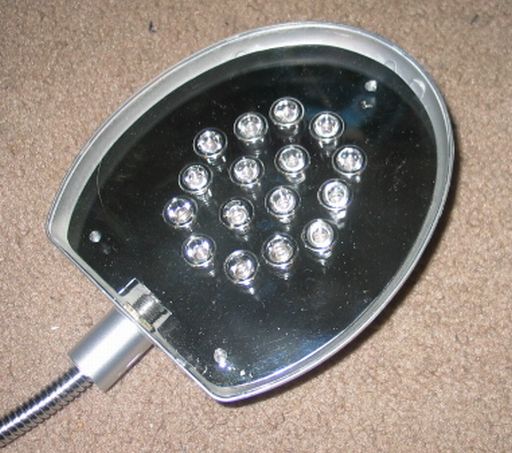 This is a floor-standing, adjustable reading lamp; designed to be placed next to your favourite chair for reading, but with a twist: instead of having a hot incandescent light bulb and a cord that could be tripped over, it uses sixteen white LEDs and is totally self-contained (it uses six AA cells).