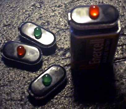They conveniently fit over an ordinary 9v battery, and exploit one usually overlooked resource in the theatre biz - the drawers full of half-used
