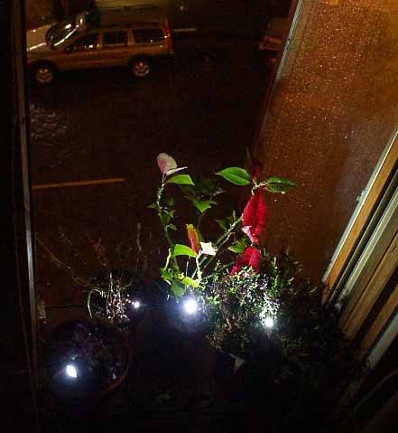 3rd floor garden window backlighted by Tri-Clusters & MicroStars. Our building has no window ledges or balconies, so I had to fudge it by making a shelf supported from the inside, so the window has to stay open 24/7. That's why I had to wait until the weather warmed above 50°F before I could begin this installation.