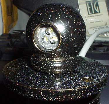 This is a brass Tri-Cluster ball that has been painted with a black gloss paint with a clear overcoat; this overcoat contains colorful, metallic "sprinkles" which gives the unit