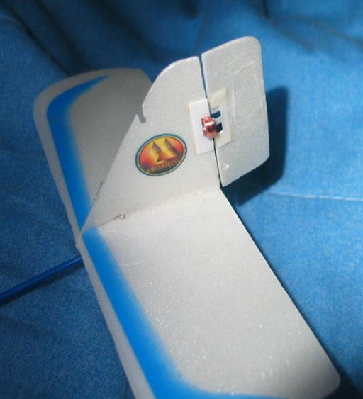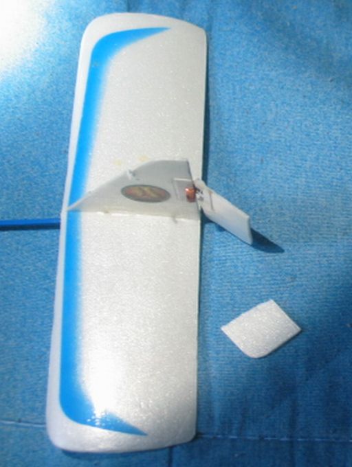 On 04-15-08, I was charging the cute and loveable little biplane on my bed, and the cat stepped on it, breaking the tail (horizontal stabiliser) and causing the rudder to become "stuck" to the left. To wit, here's a photograph of it: