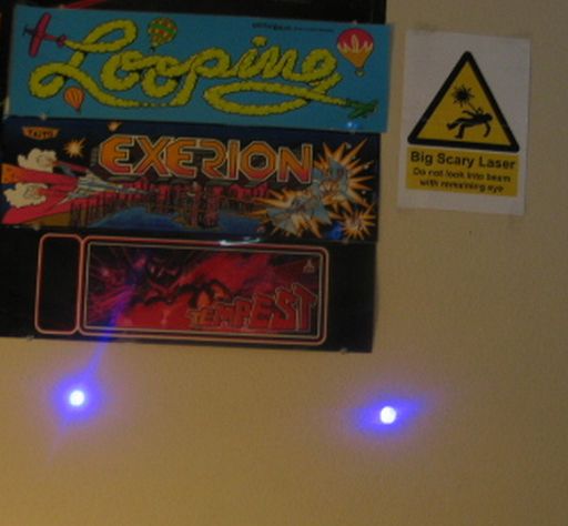 As I stated earlier, it uses a Sony Blu-ray laser diode that is reported to output 20mW of laser radiation at 405nm in the violet part of the spectrum. Because it is at the violet end of the spectrum, it will not be as visible mW-per-mW as blue, green, yellow, or red laser pointers, but the color is absolutely gorgeous, and is very radiant and unusual for a handheld laser.