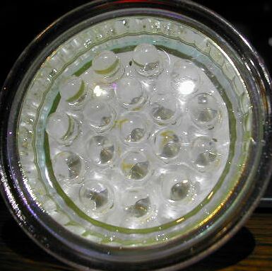 Photograph of the front of the bulb, showing the 18 NUV LEDs behind glass.