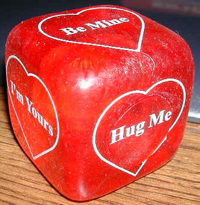 Each side of the die has a Valentine's sentiment printed on it, such as "I'm Yours" and "Hug Me".