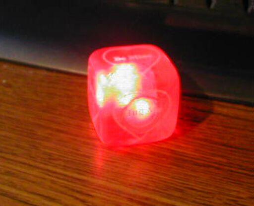 This is a very seasonal product (for Valentine's day). It is a soft, rubbery die (the singular form of dice) with two red LEDs inside that flash for 15 seconds when the die is tossed or rolled - such as on a table or desk.