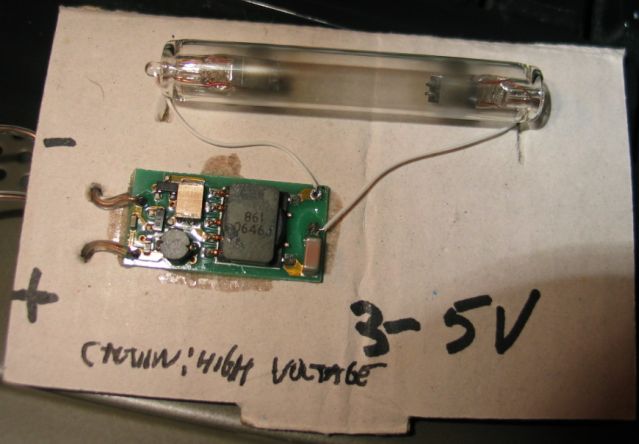 This is a UVC (ultraviolet-C), fluorescent tube and tiny high-voltage PSU (power supply unit).