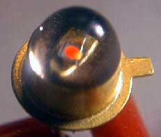 The odd looking LED on the right (in the photograph above the three spectrographic analyses) comes in a standard sized TO92 transistor case, but emits a very usable red light rather than acting like a typical transistor. One e-mailer speculates it may have been a voltage reference, but I'm not sure how to test that theory just yet. Another source (a former Motorola insider) thinks they were made by Motorola for Eastman Kodak to be used inside one type of camera. Cost effectiveness was the issue here; just use the existing machinery they had on hand for making transistors. The center lead is the cathode; and only one of the outer leads (for the anode) was actually used; the other doesn't connect to anything.